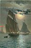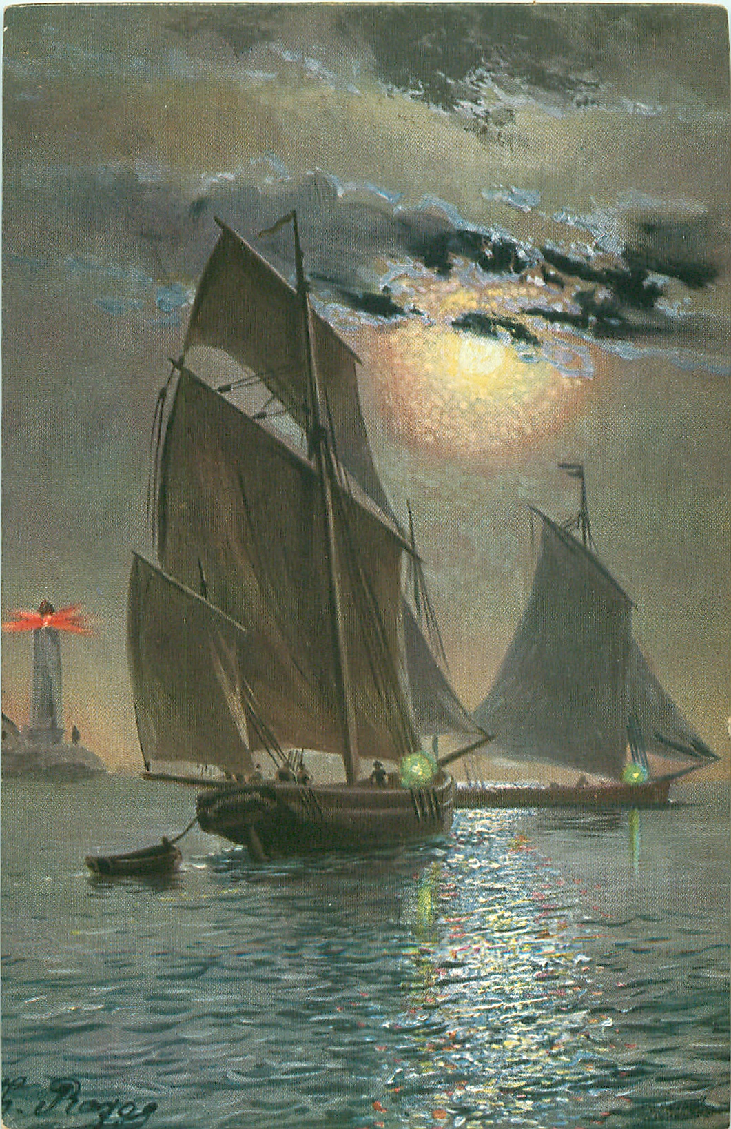 night sea view, sailboats crowded together centrally, lighthouse left, moon central/right