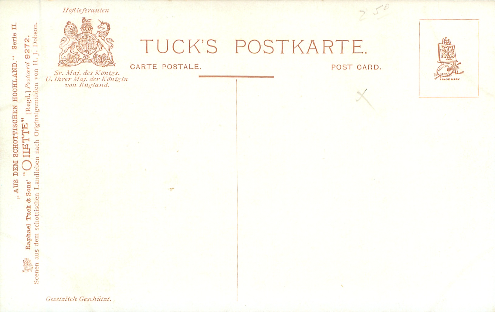 OILETTE, GESETZLICH GESCHUTZT, SCENEN AUS DEM SCHOTTISCHEN LANDLABEN ORIGINALGEMALDEN VON H.J. DOBSON, same images English backs OILETTE 9272 SCOTTISH LIFE AND CHARACTER, SERIES II