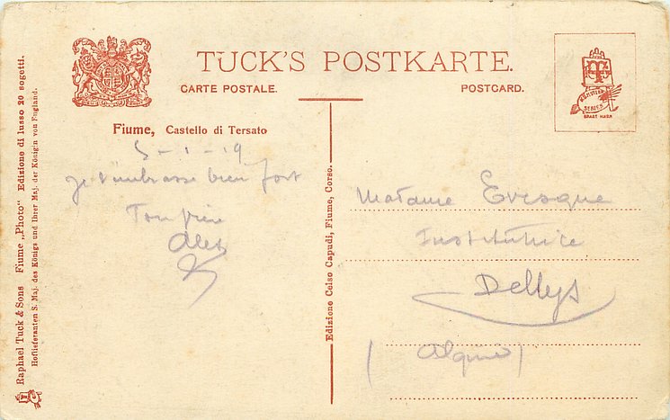 sepia on yellow background, FIUME PHOTO EDIZIONE DI LUSSO 20 SOGETTI, EDIZIONE CELSO CAPUDI, FIUME, CORSO (vert. mid-card), back partly in German