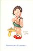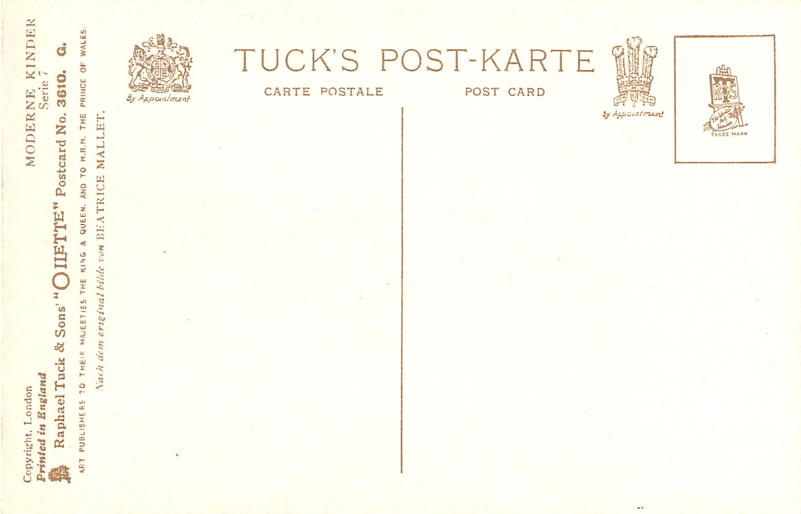 OILETTE, PRINTED IN ENGLAND, COPYRIGHT LONDON, NACH DEM ORIGINAL BILDE VON BEATRICE MALLET, G for German language, same image & number English back CUTE KIDDIES