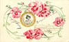 HERZLICHEN GLUCKWUNSCH nouveau style gilt inset, showing woman looking front, pink pansies