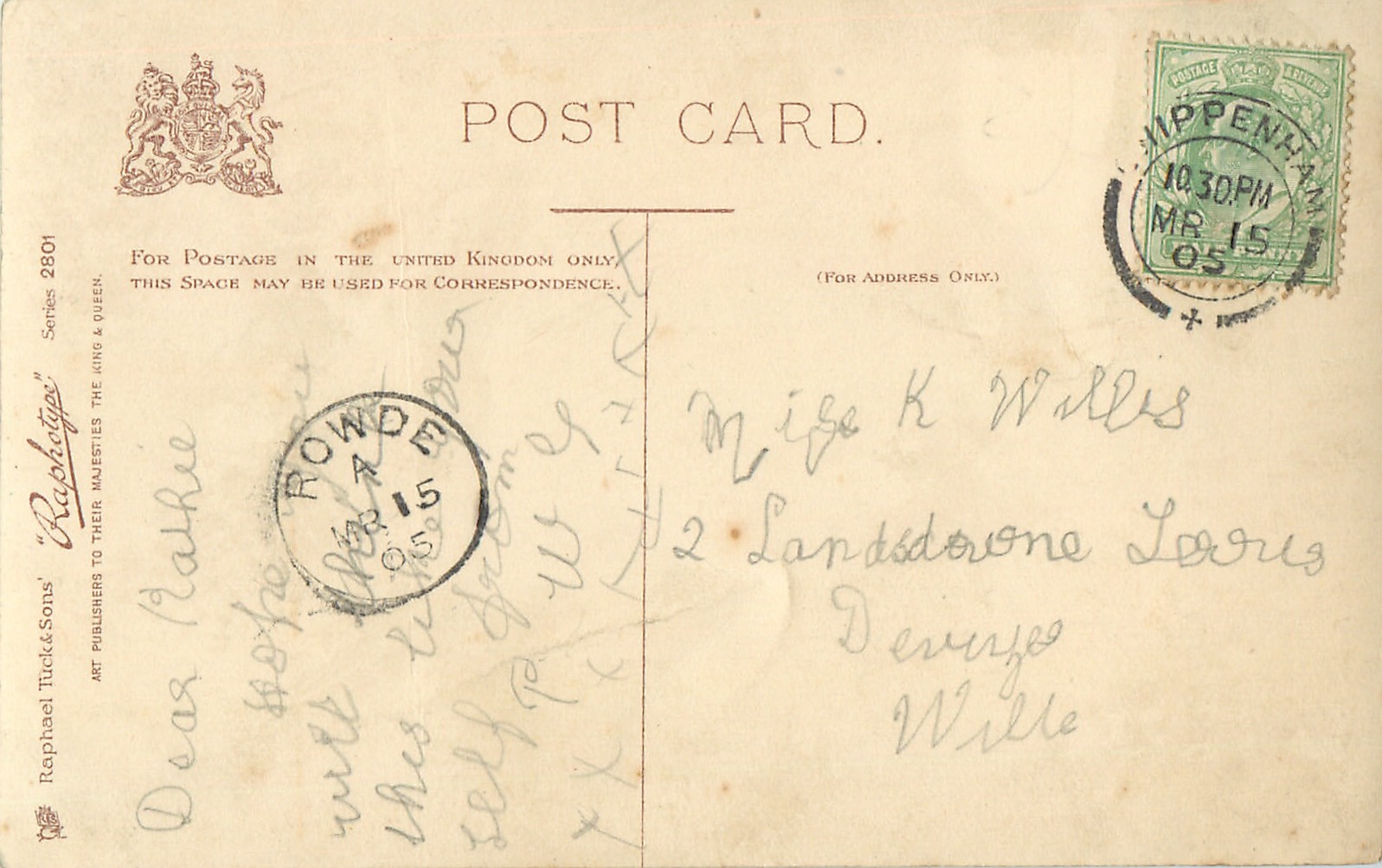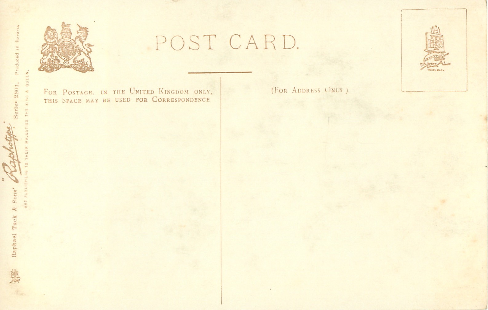 RAPHOTYPE, PRODUCED IN BAVARIA or PHOTOTYPED IN BAVARIA (in stamp box), come with artists name in red or black, same images 290I in grey/green, listed in 1904 POSTCARD Catalogue