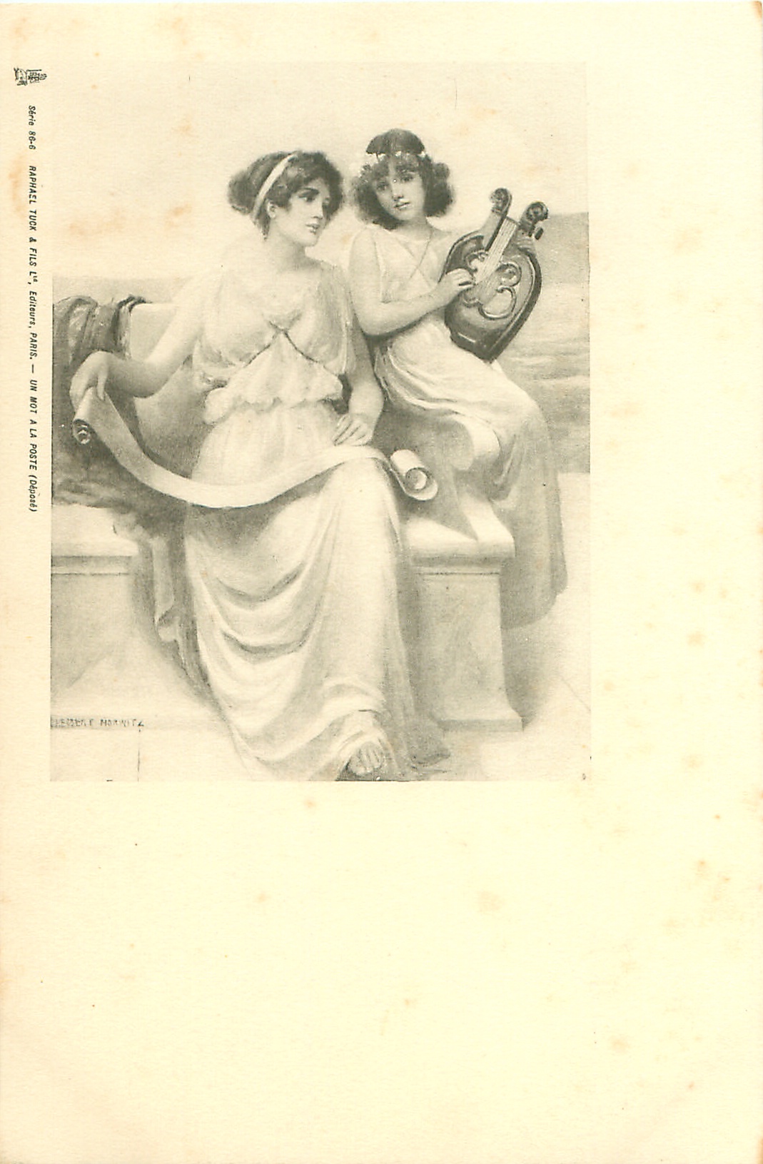 girl plays old style instrument to mother seated left, HARMONY in English editions