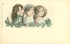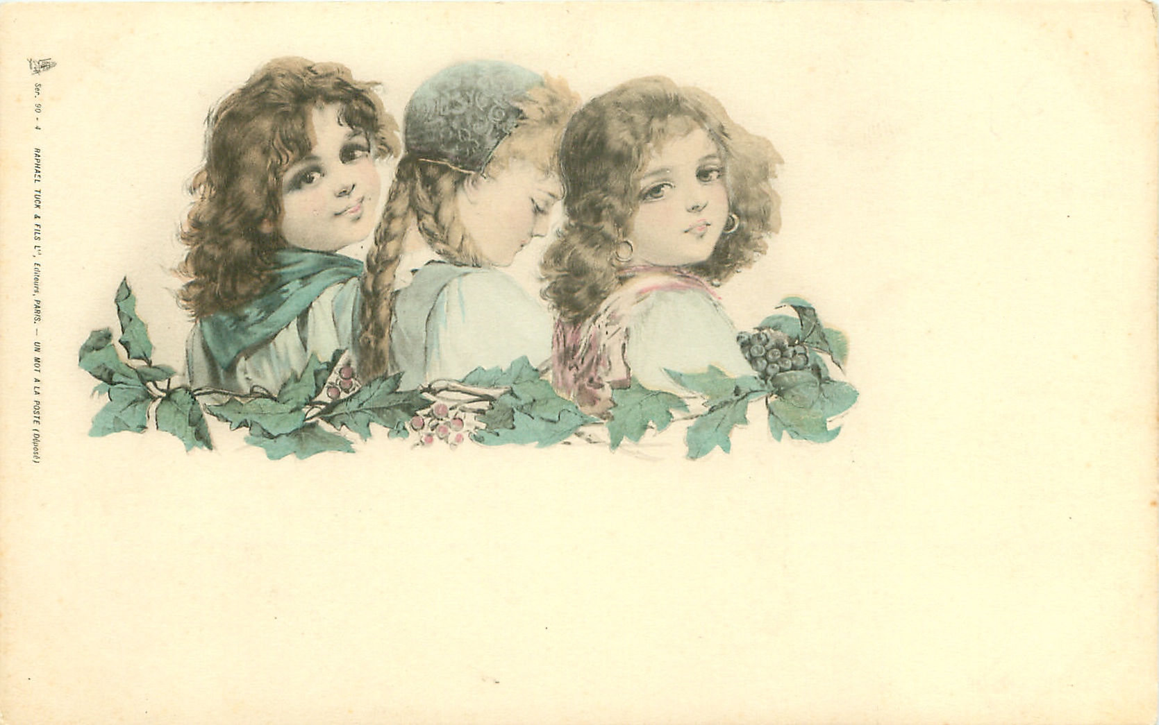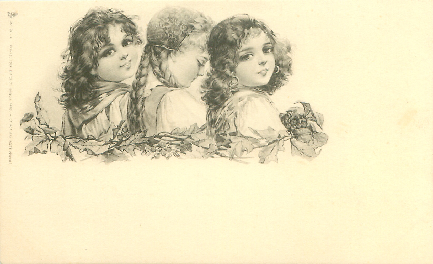 three girls in gowns face away right, girl in centre looks down, the others turn their heads to look front, holly horizontally in front below