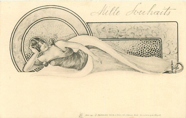 MILLE SOUHAITS woman reclines, head supported on her hand, eyes closed