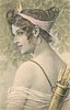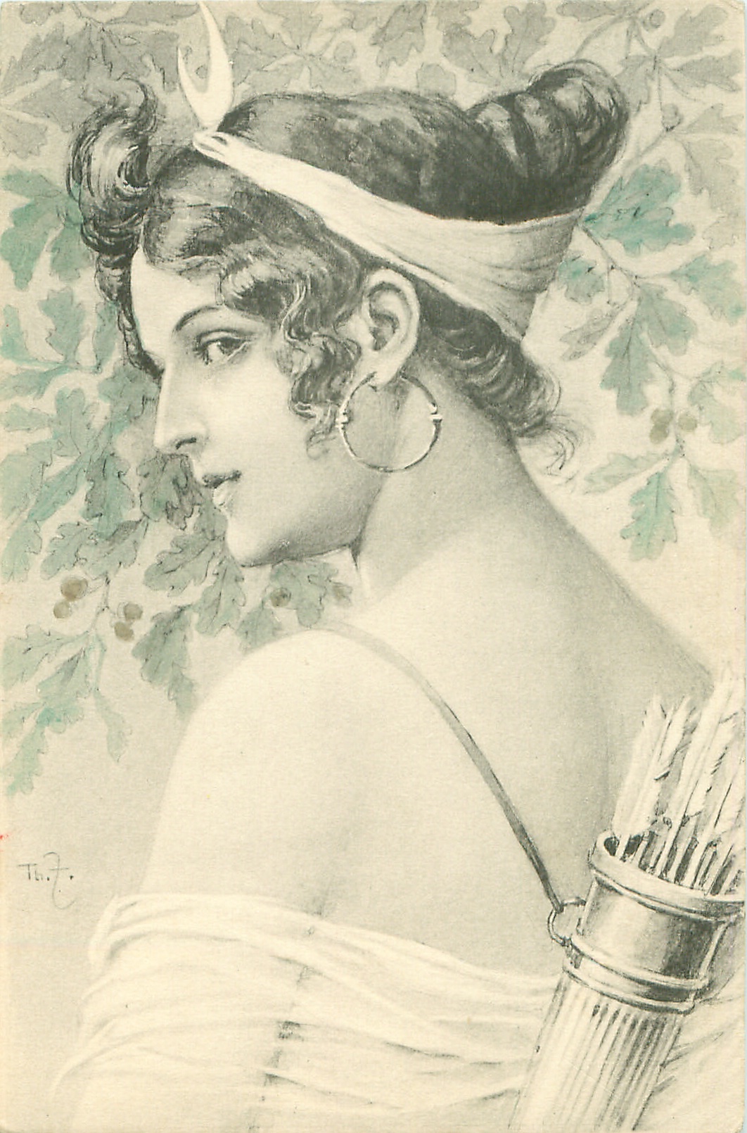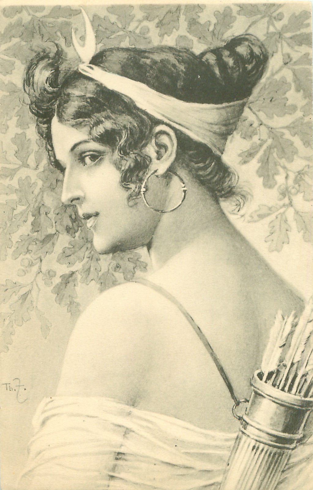 head & shoulder study of girl with quiver of arrows, facing away, looking over her left shoulder