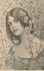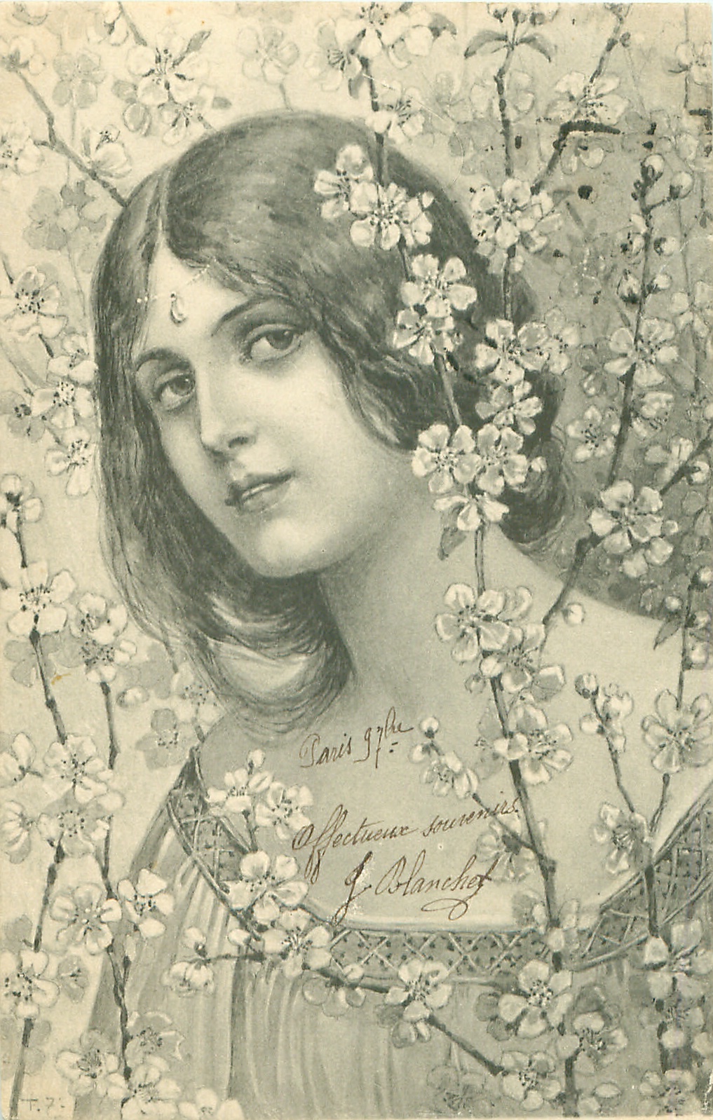 head & shoulders of woman looking out of framework of blossom, facing slightly left, looking front