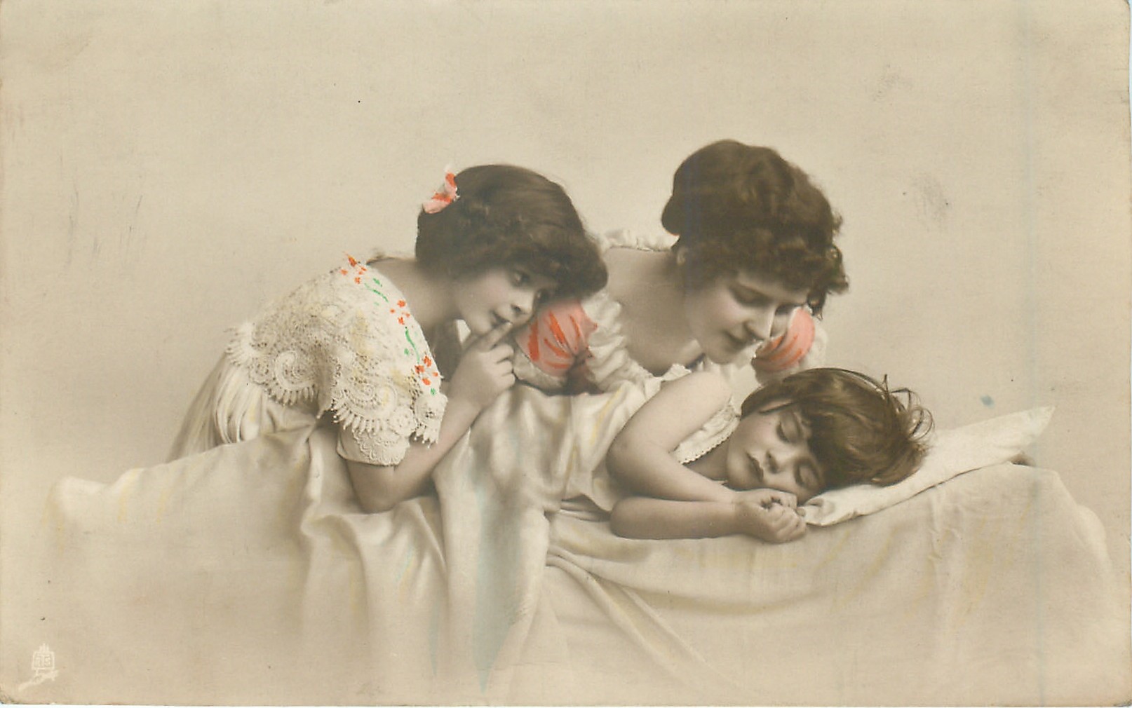 woman and kid look at sleeping child, kid holds finger to mouth