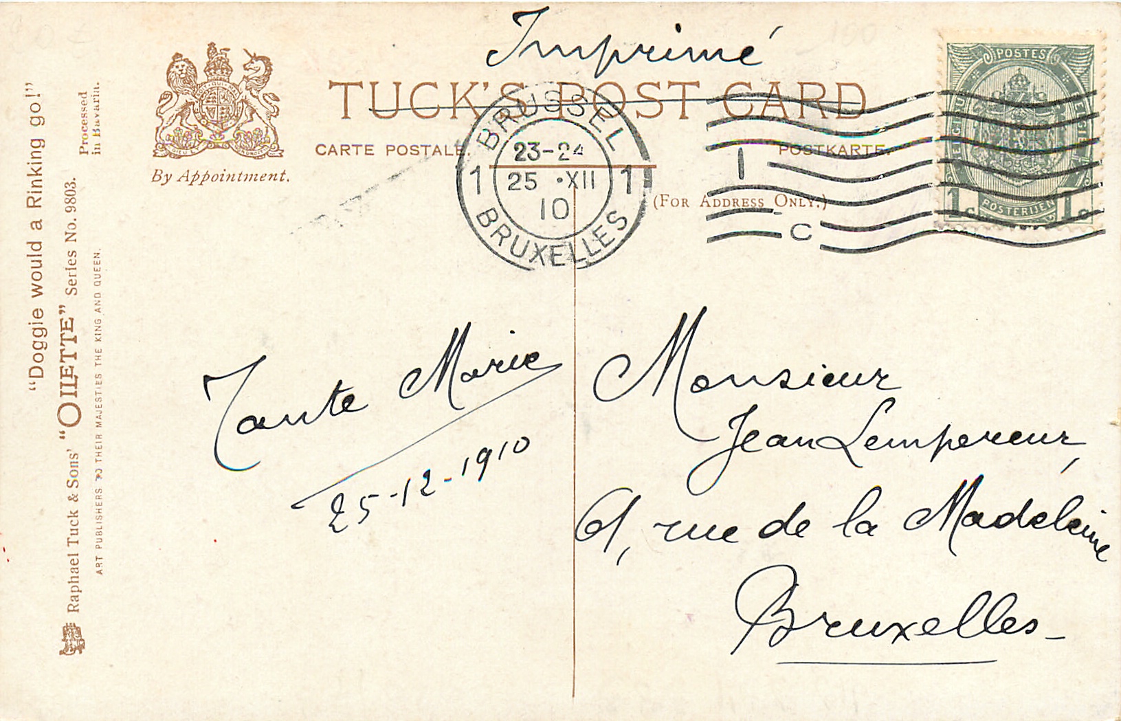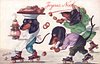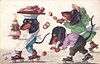 OILETTE, PROCESSED IN BAVARIA, listed as THE SKATING CARNIVAL in 1911/1912 & 1913/1914 Postcard Catalogues, same images German backs 9803 OILETTE & titled DACKEL AUF ROLLSCHUHEN