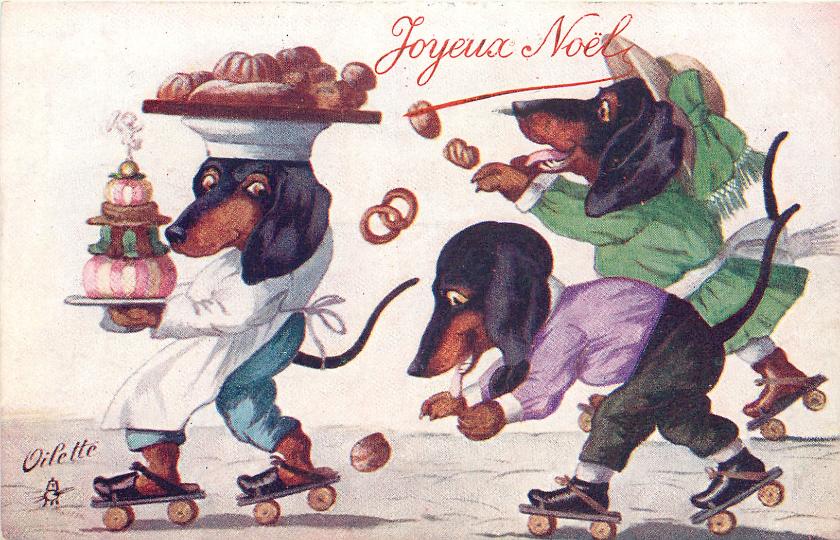 three dachshunds roller skating left, cook with plate of cakes on his head is loosing some to young followers
