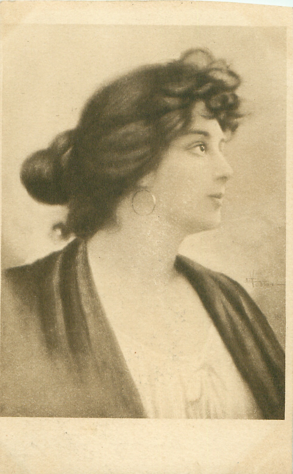 she faces front & slightly right looking up
