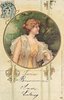woman in yellow/white dress holding book in left hand, in gilt circle