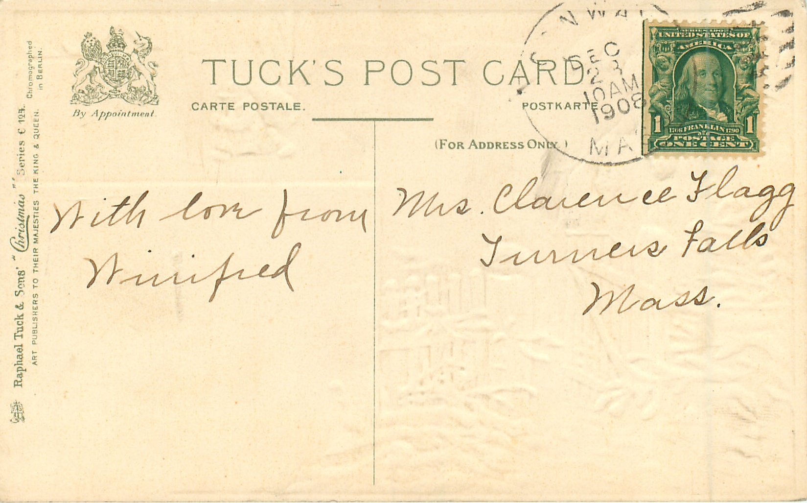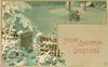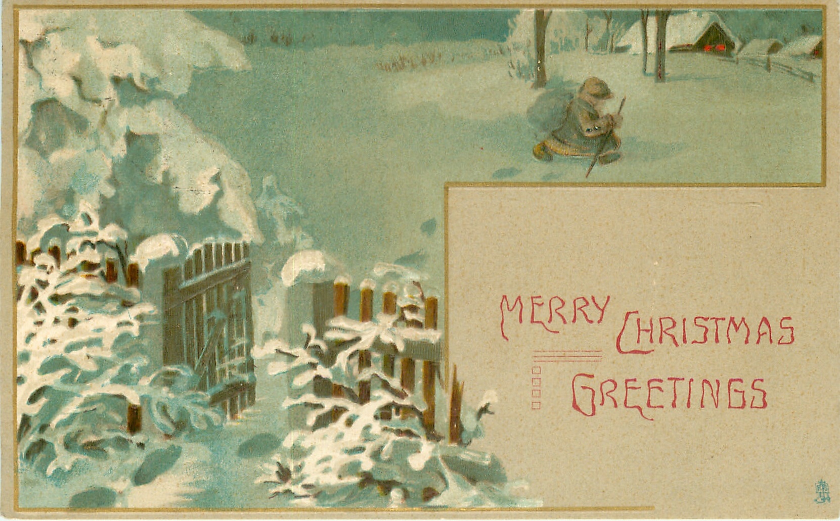 MERRY CHRISTMAS GREETINGS dwarf walks away to distant cottage