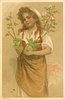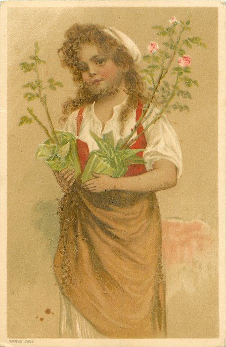 young woman facing & looking slightly left, wearing brown apron, holding two pots containing rose bushes