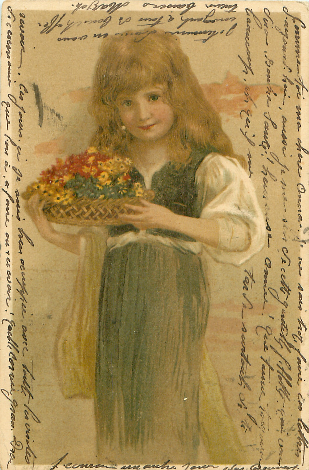young woman facing & looking front, wearing green dress, carrying flat wicker basket of flowers with both hands