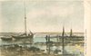 three sailboats, row boat left, one person in boat, two centrally on shore, prominebt shadows