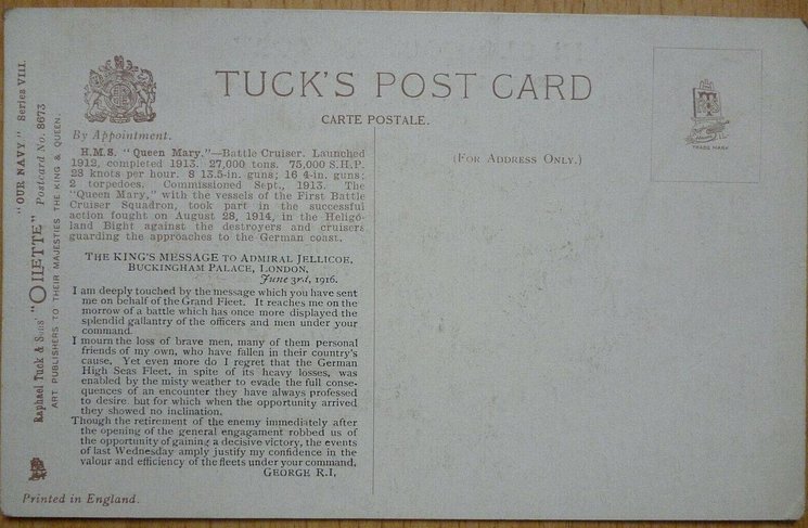 comes with an overprint and an extra message on the reverse IN GLORIOUS MEMORY NORTH SEA-OFF JUTLAND. MAY 31st, 1916