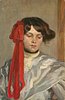 head & shoulder study of woman wearing red scarf descending from her hair, silver dress, she looks down