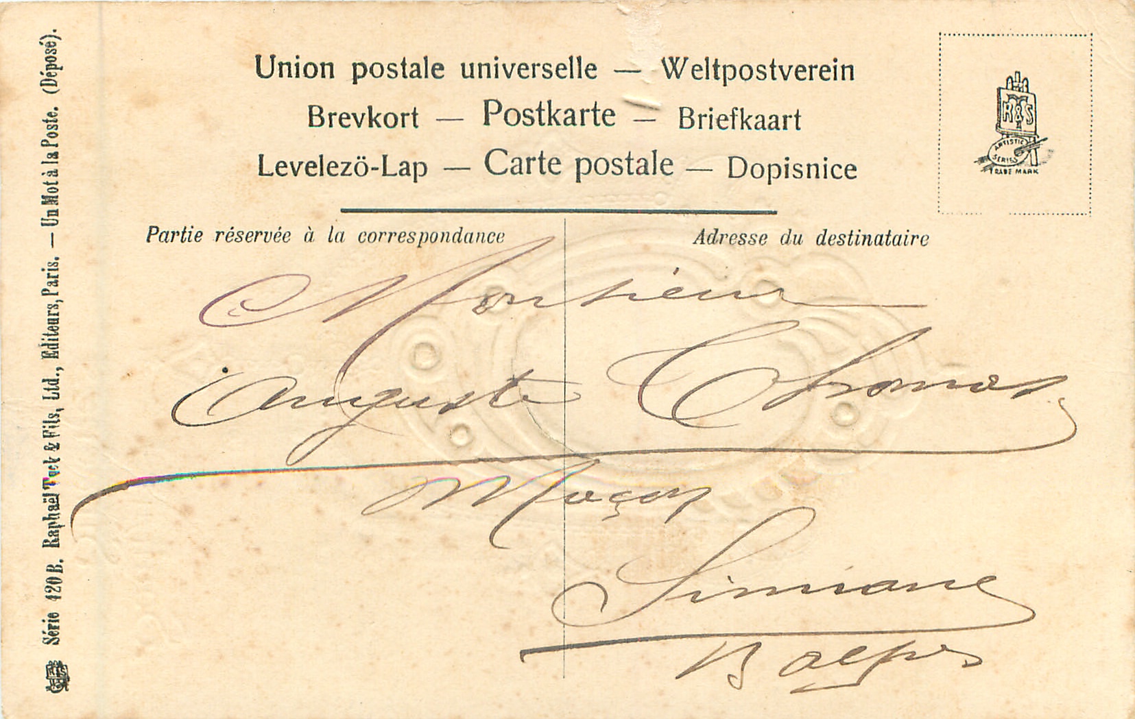 UN MOT A LA POSTE, (DEPOSE), deeply embossed nouveau ornaments in frame surrounding insets to green cards, with or w/o backing board, International backs,