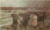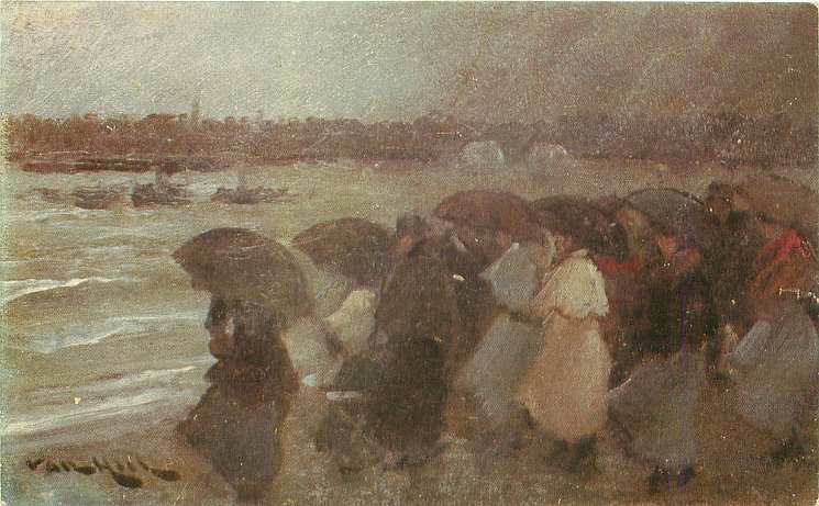 crowd of women on stormy beach under umbrellas awaitng return of fishers