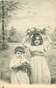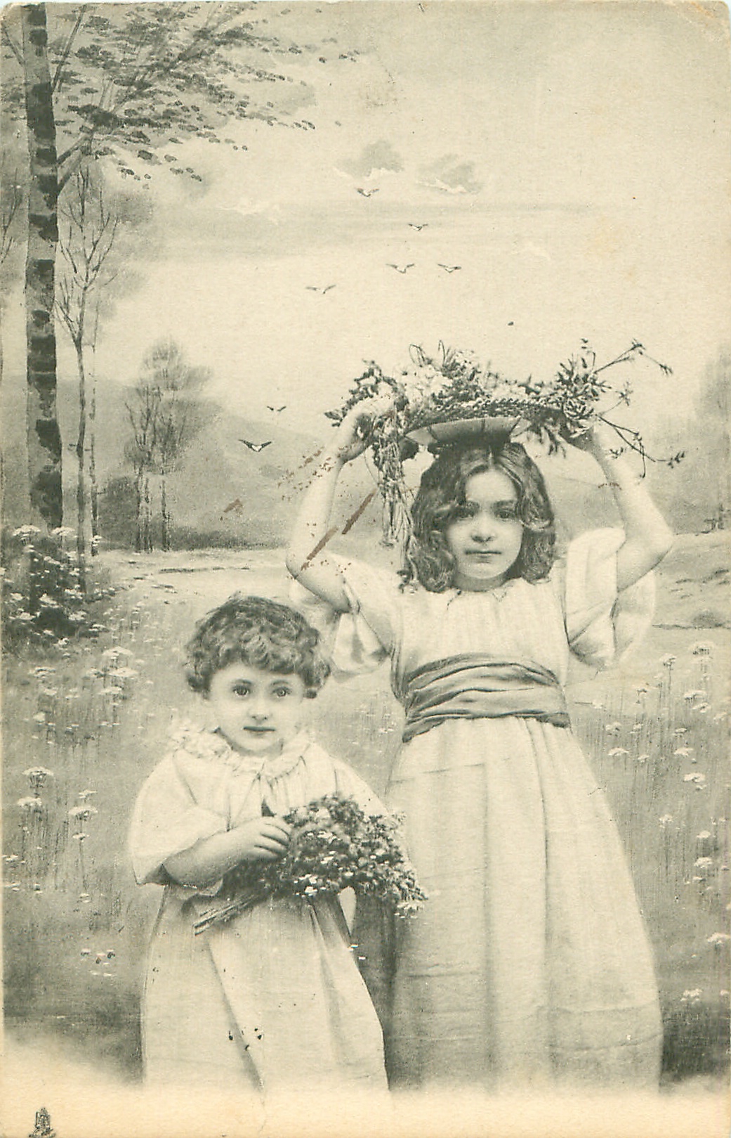 two children, girl right holding flowers on her head, smaller child left holds armful of flowers