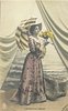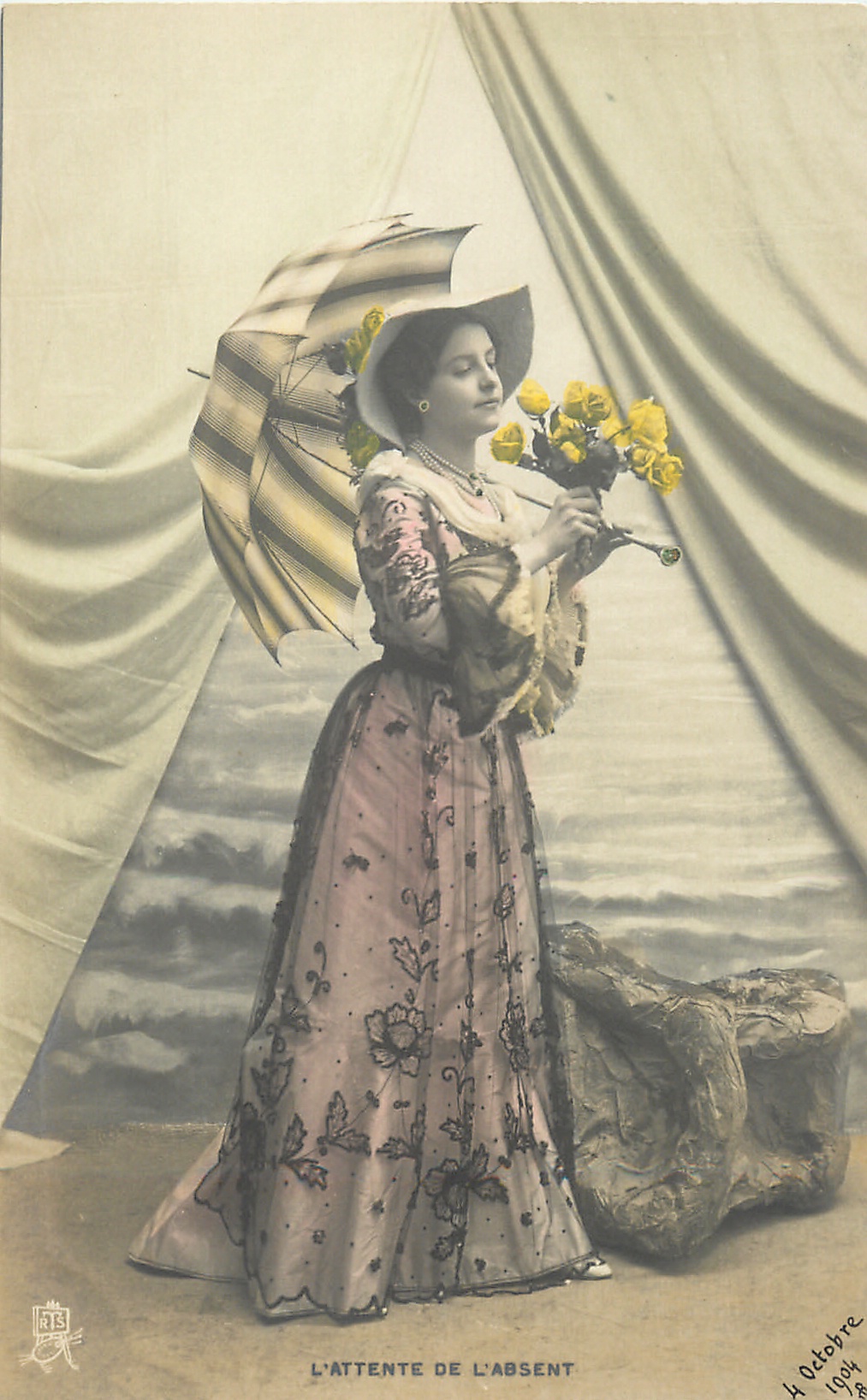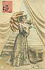 photographic, come in several pastel shades, UN MOT A LA POSTE, (DEPOSE) girl posed in front of split curtains, elaborate dress