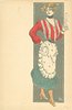 woman in red blouse striped in grey & white apron stands smoking, facing front right looking back left