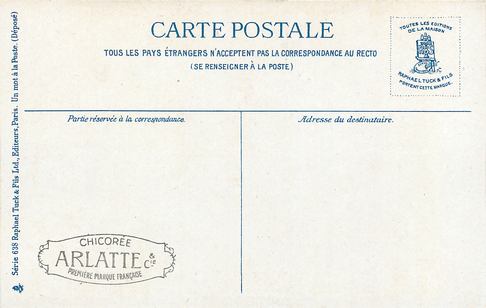 blue backs, UN MOT A LA POSTE, (DEPOSE), text below 6 small illustrations on each card, come CHICOREE ARLATTE back