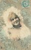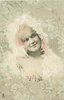 girl wearing white feather cape over head & shoulders, no hands visible, faces & looks front, flowers around