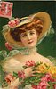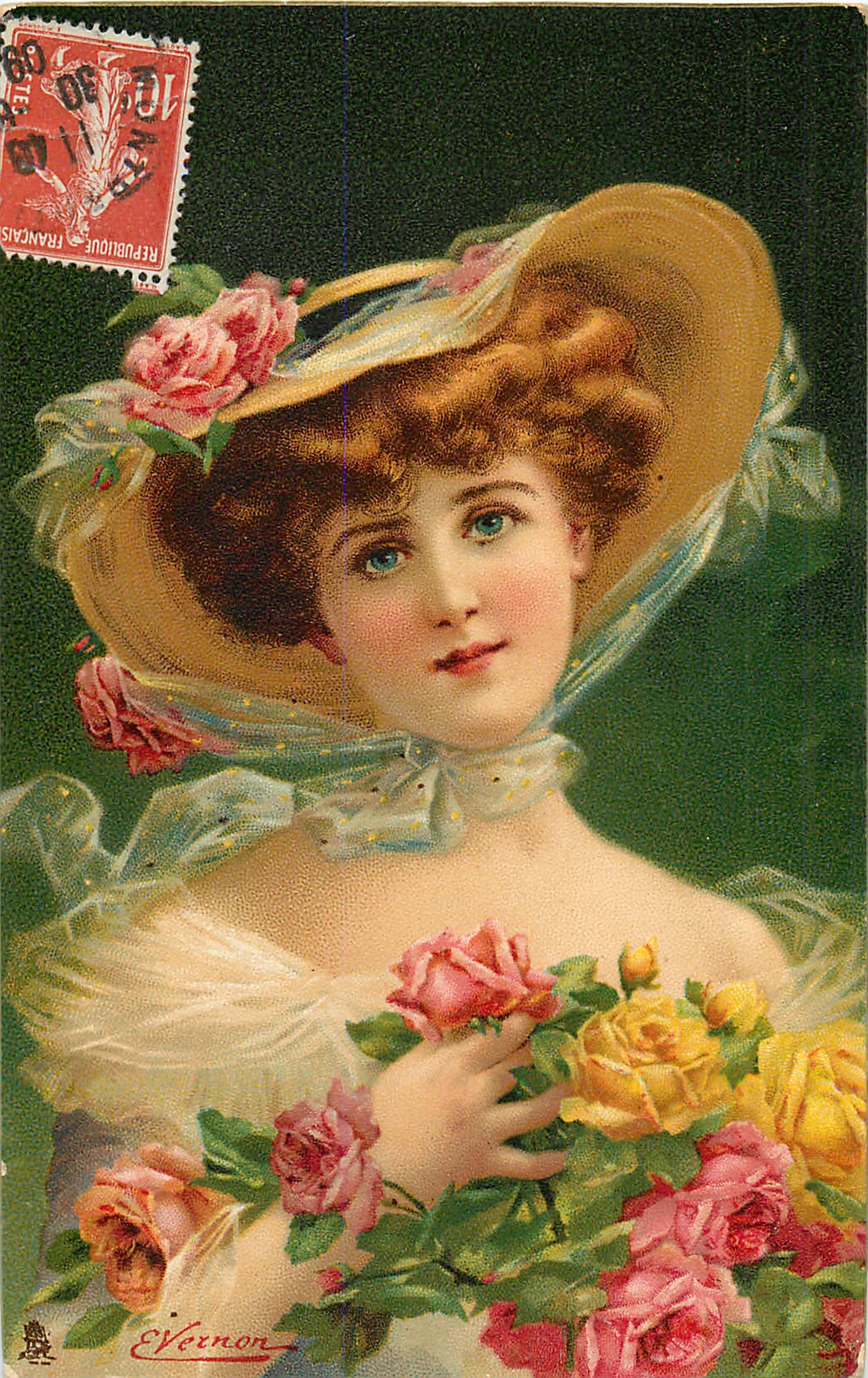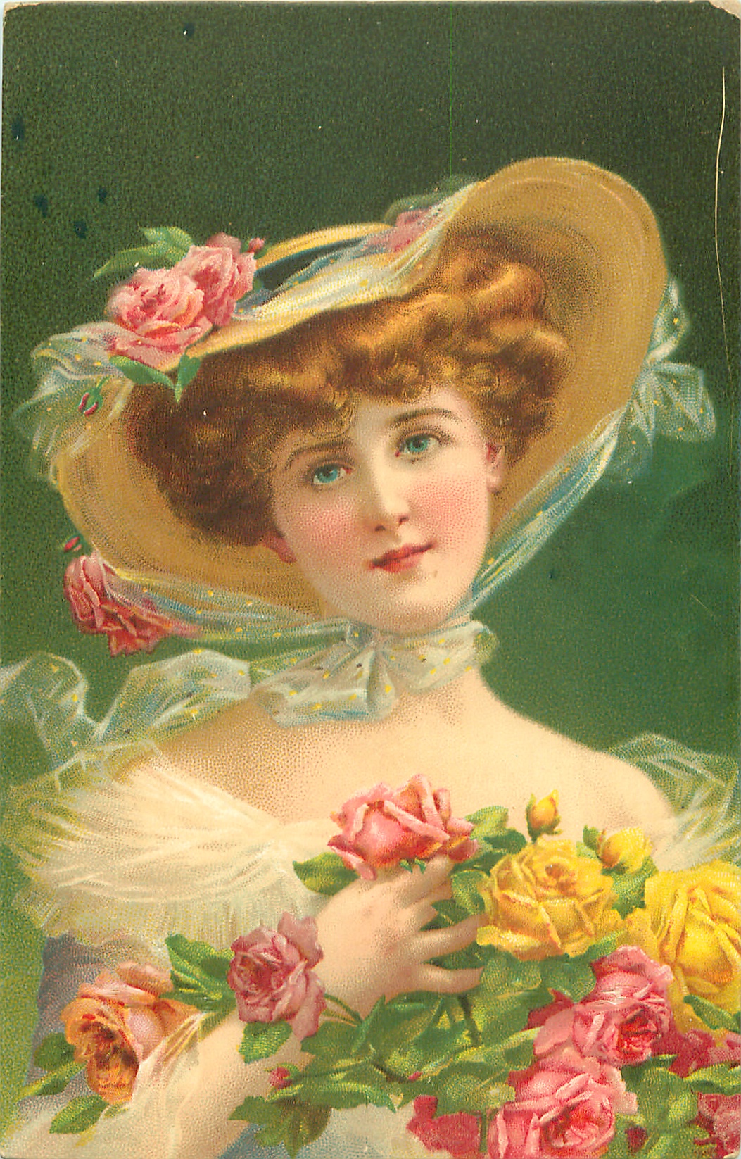 woman with short brown hair, elaborate hat, flimsy wrap, holding many roses to her chest, looking front