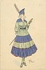 stick held behind her back, blue/light green dress