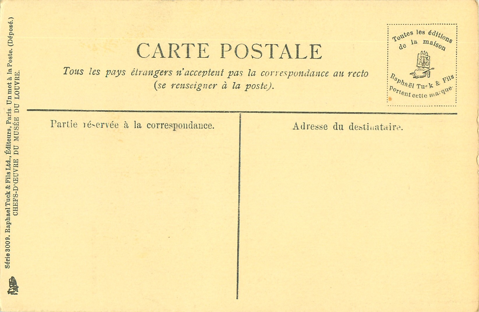 brown/purple,UN MOT A LA POSTE, (DEPOSE), same image & number, German/International back 3009 COLLECTION ALTER MEISTER AUS DEN FRANZOSISCHEN GALERIEN with inscription,front title & artist in French