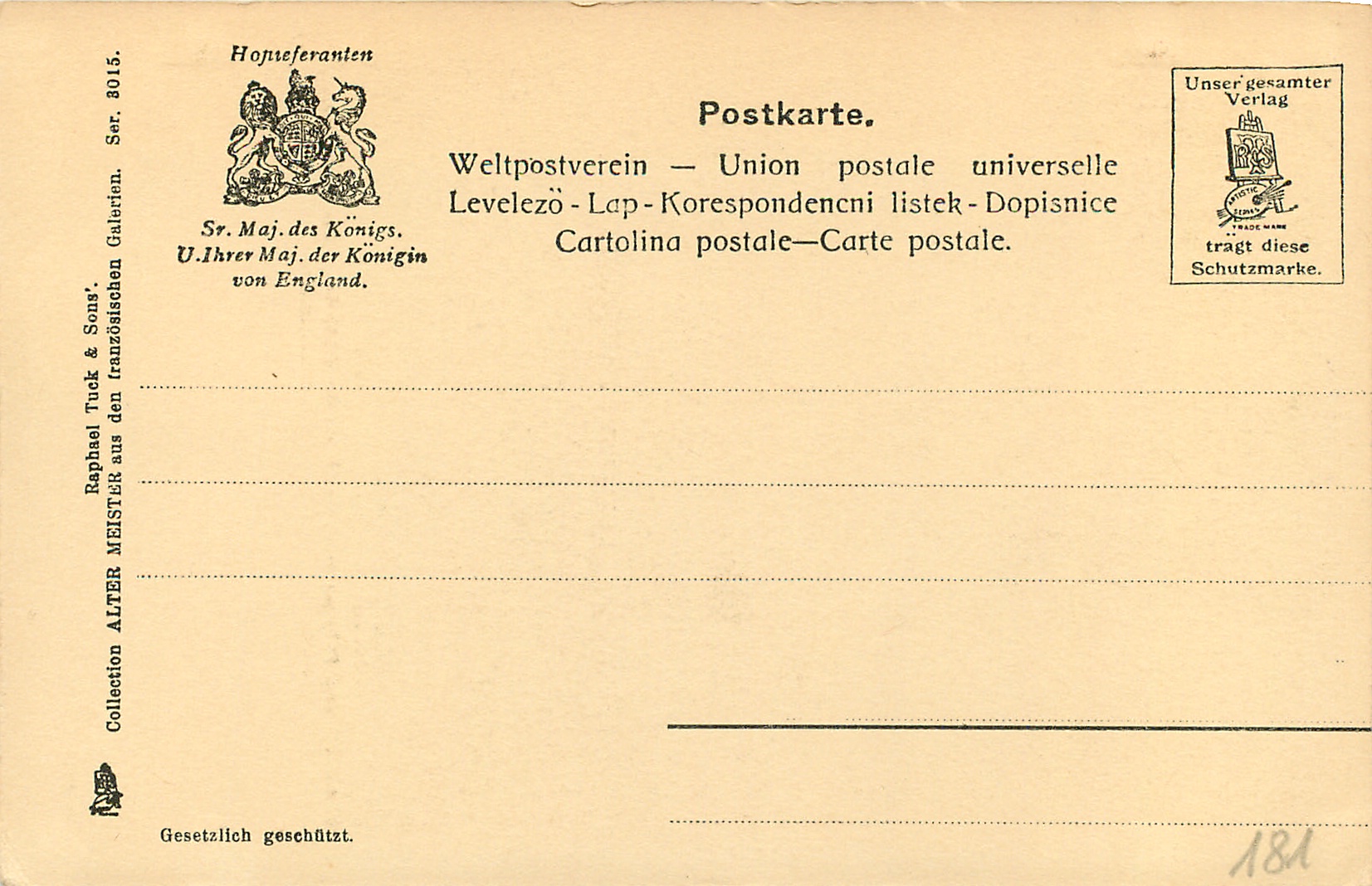 brown/purple, UN MOT A LA POSTE, (DEPOSE), same image & number, German/International back 3015 COLLECTION ALTER MEISTER AUS DEN FRANZOSISCHEN GALERIEN with inscription,front title & artist