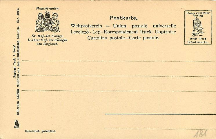 brown/purple, UN MOT A LA POSTE, (DEPOSE), same image & number, German/International back 3015 COLLECTION ALTER MEISTER AUS DEN FRANZOSISCHEN GALERIEN with inscription,front title & artist