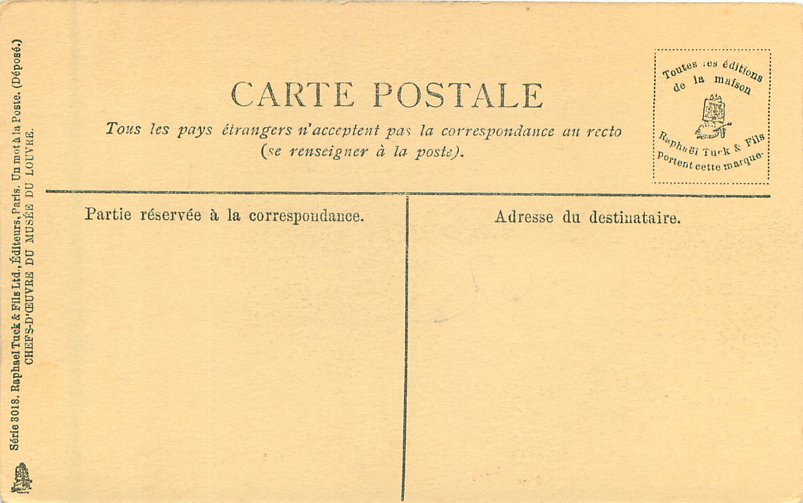 brown/purple,UN MOT A LA POSTE, (DEPOSE), same image & number, German/International back 3018 COLLECTION ALTER MEISTER AUS DEN FRANZOSISCHEN GALERIEN with inscription,front title & artist in French