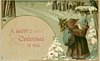 A HAPPY CHRISTMAS TO YOU , dwarf Santa clears snow from sign by snowy road, crow observes