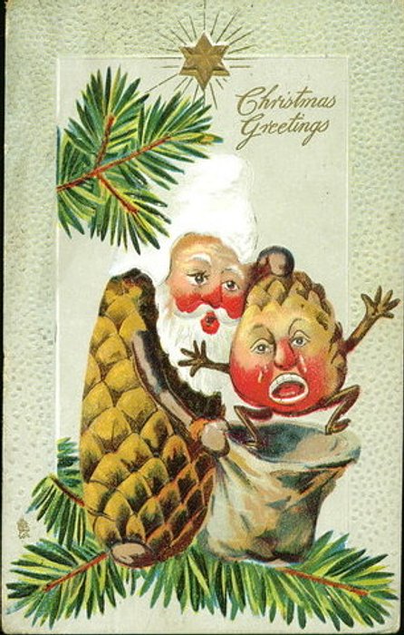 CHRISTMAS GREETINGS Santa puts crying young pine-cone person insack