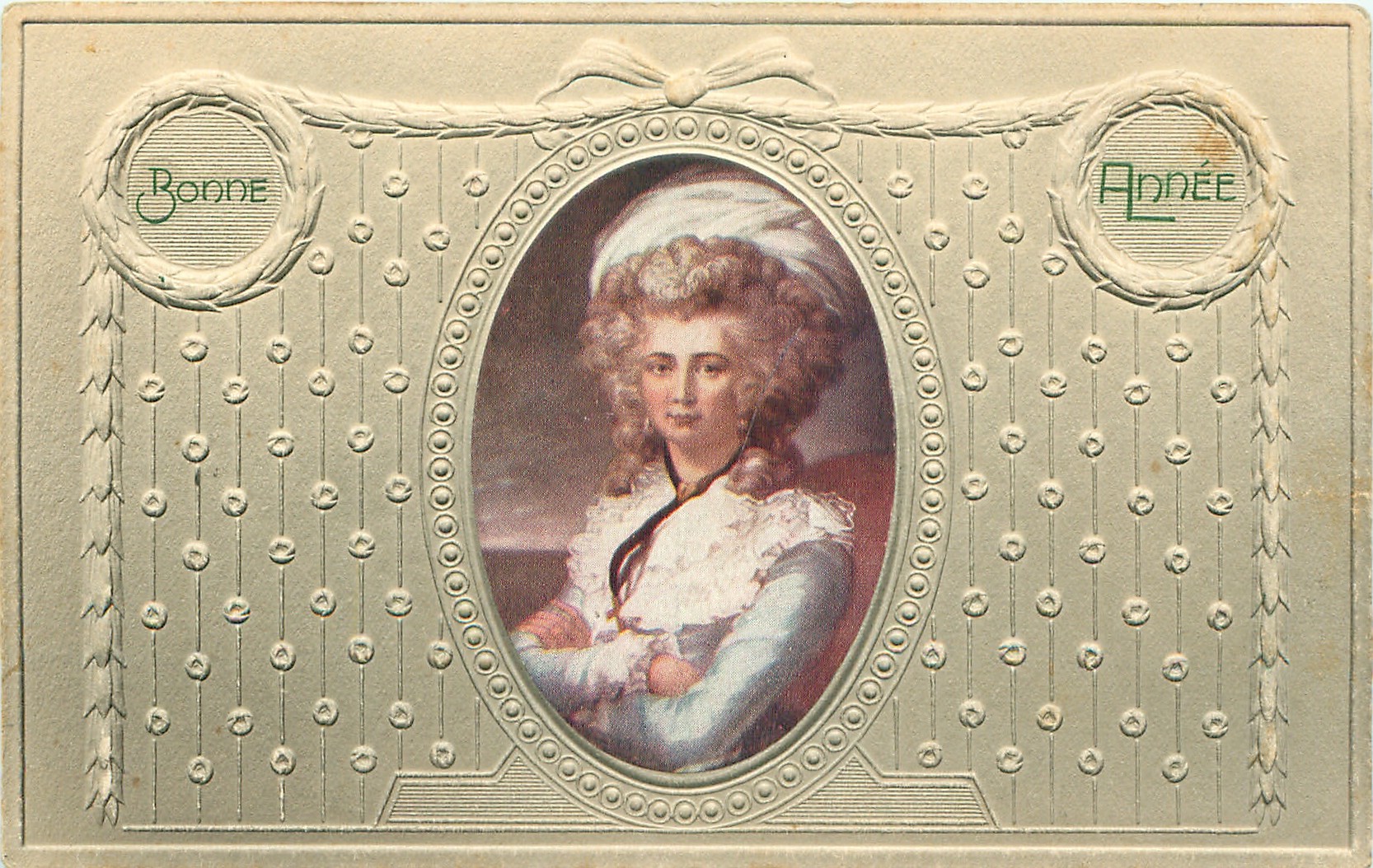 BONNE ANNEE or BONNE FETE inset head & shoulders of pretty blonde with curly hair, arms folded in front of her