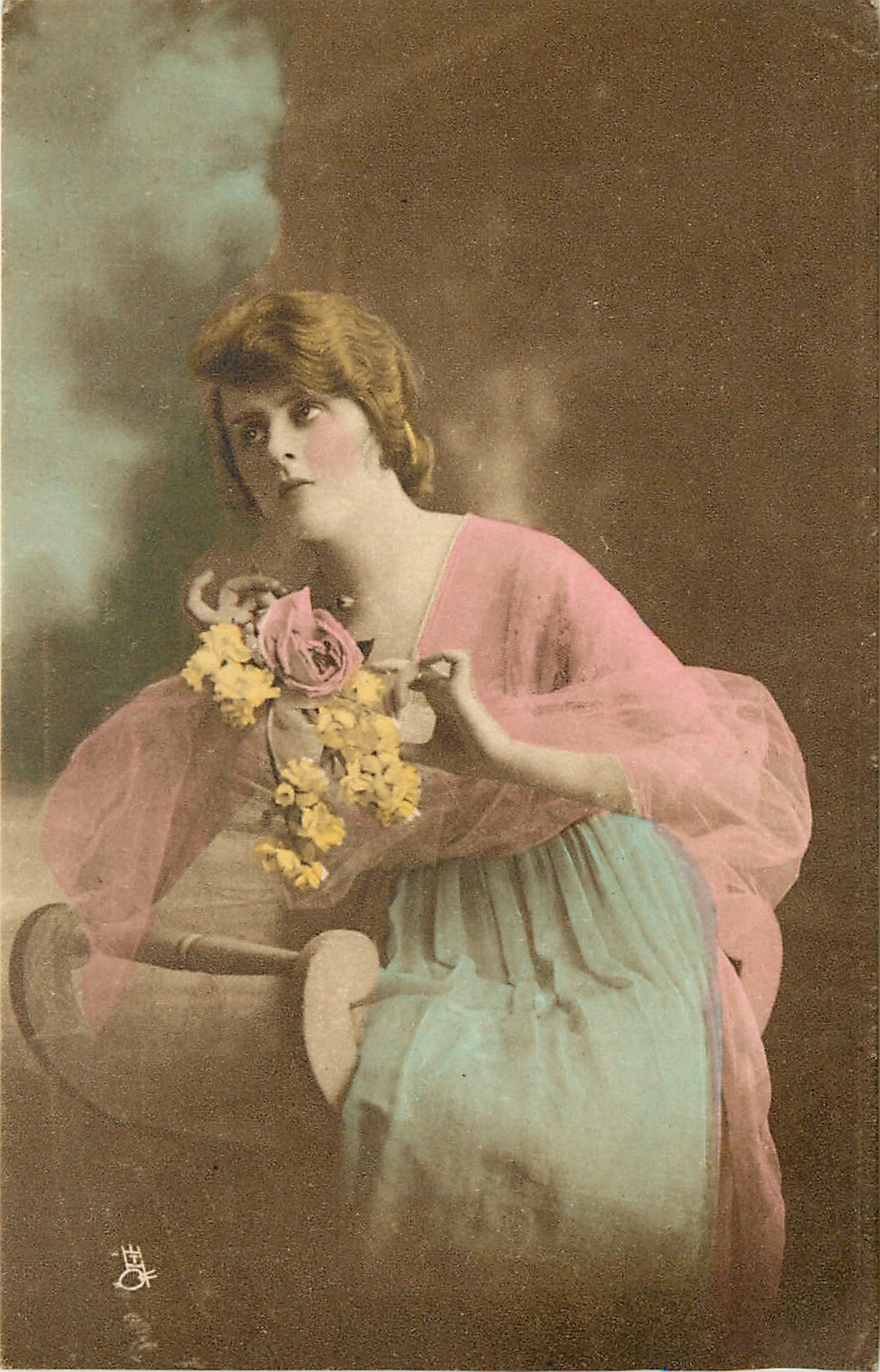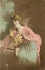 sittting facing left, looking up and left, flowers held by both hands, chest level