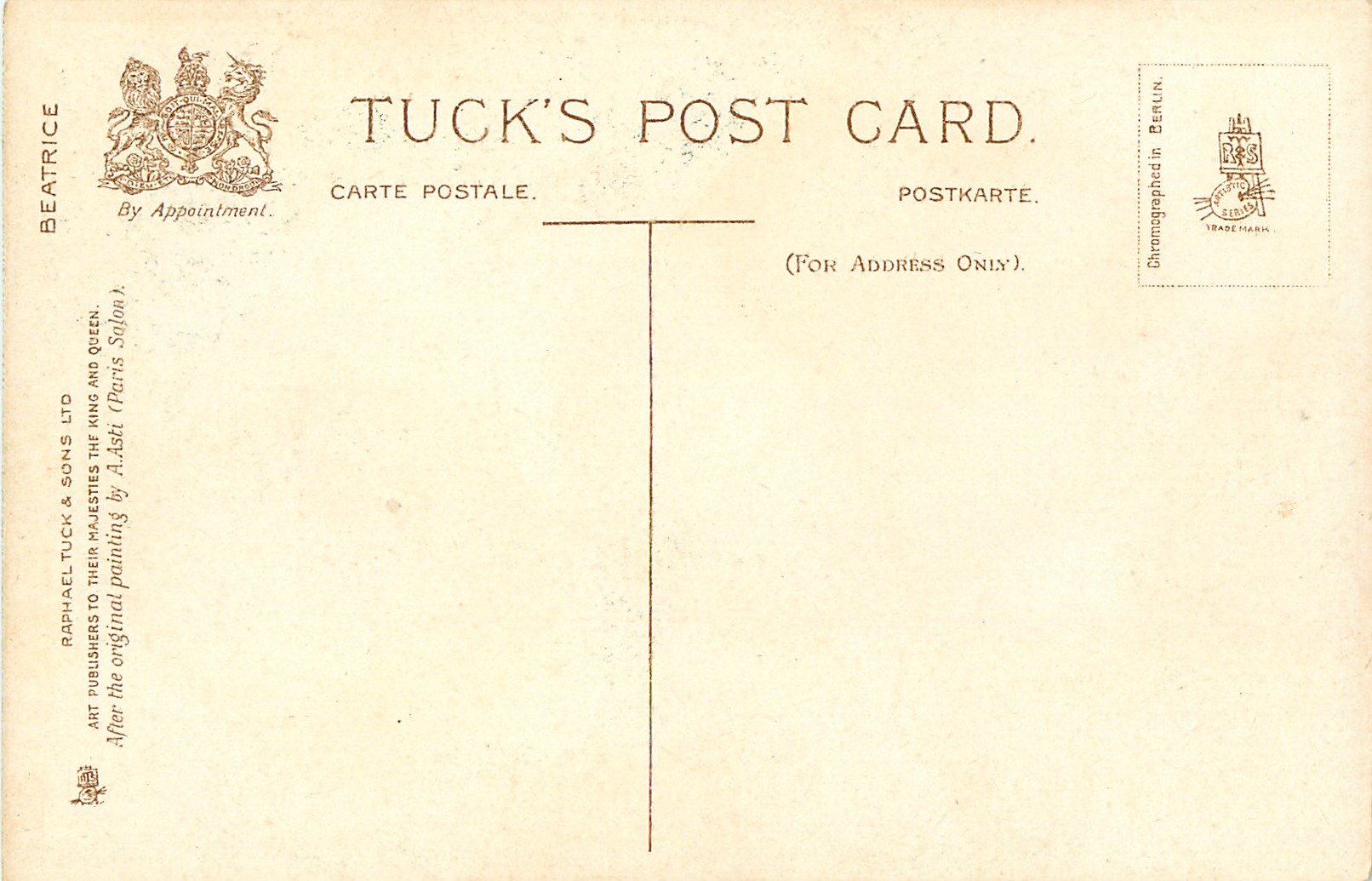 CHROMOGRAPHED IN BERLIN, AFTER THE ORIGINAL PAINTING BY A. ASTI (PARIS SALON)., these images were used widely by Tuck, see "artist"