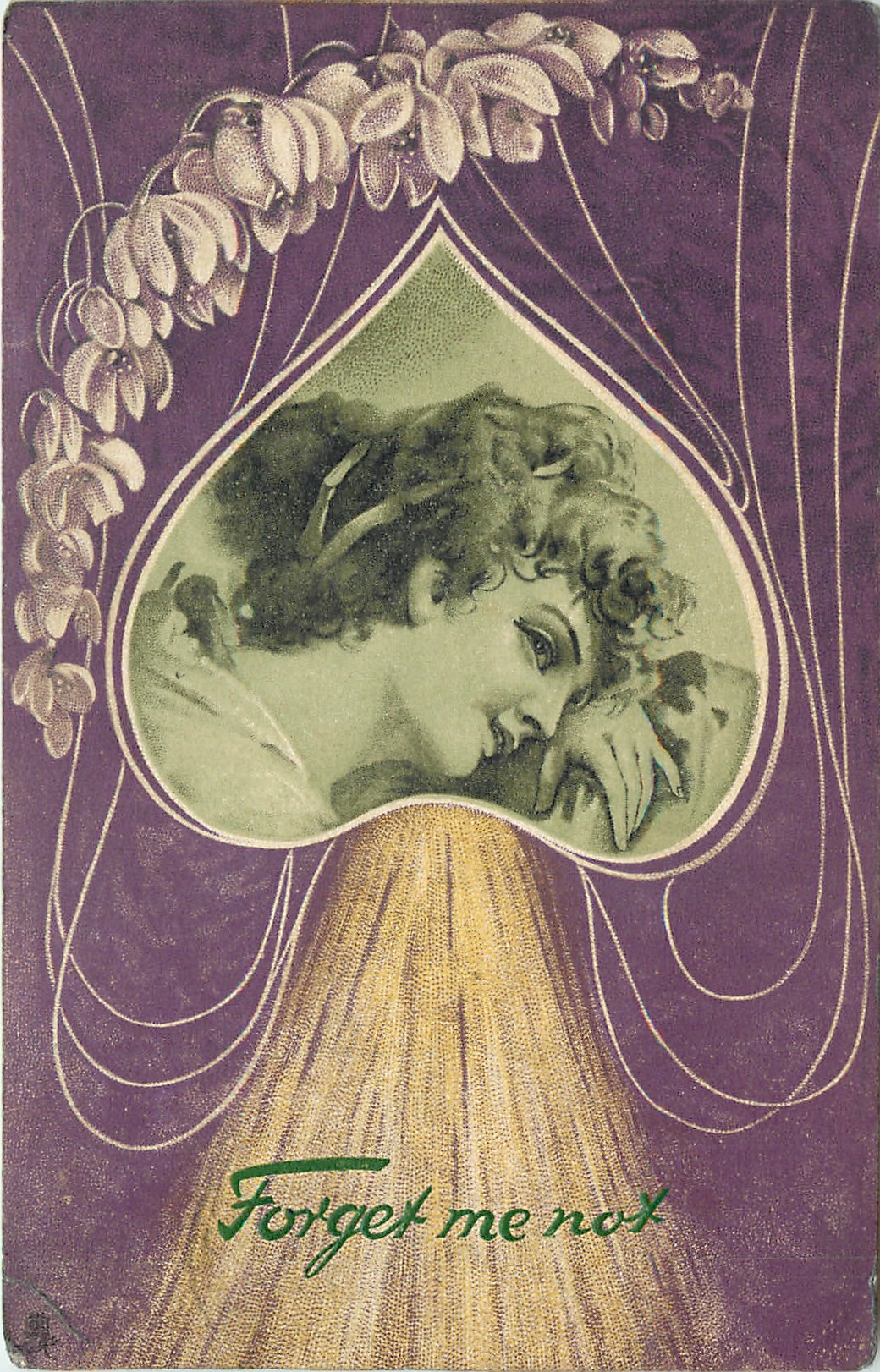girl's head resting on hand, in inverted heart, green on violet