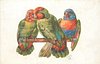 three parrots on perch, one in middle faces away, looks left