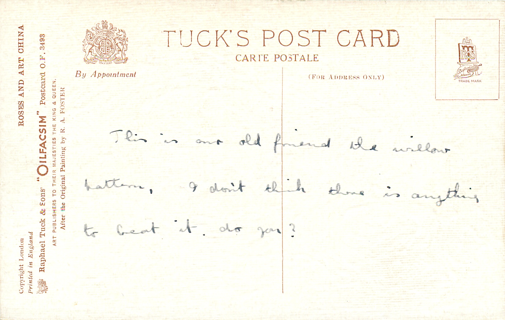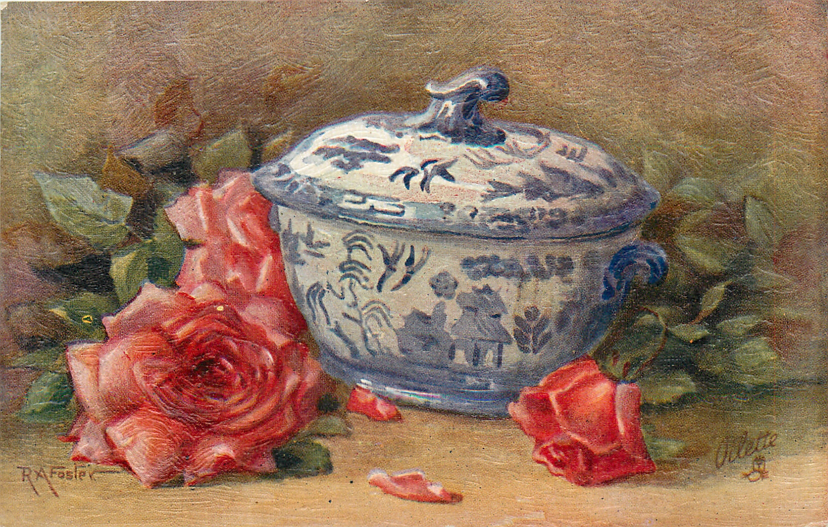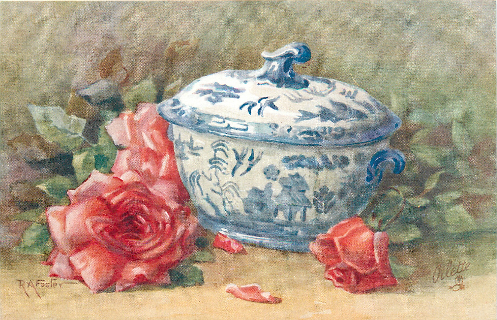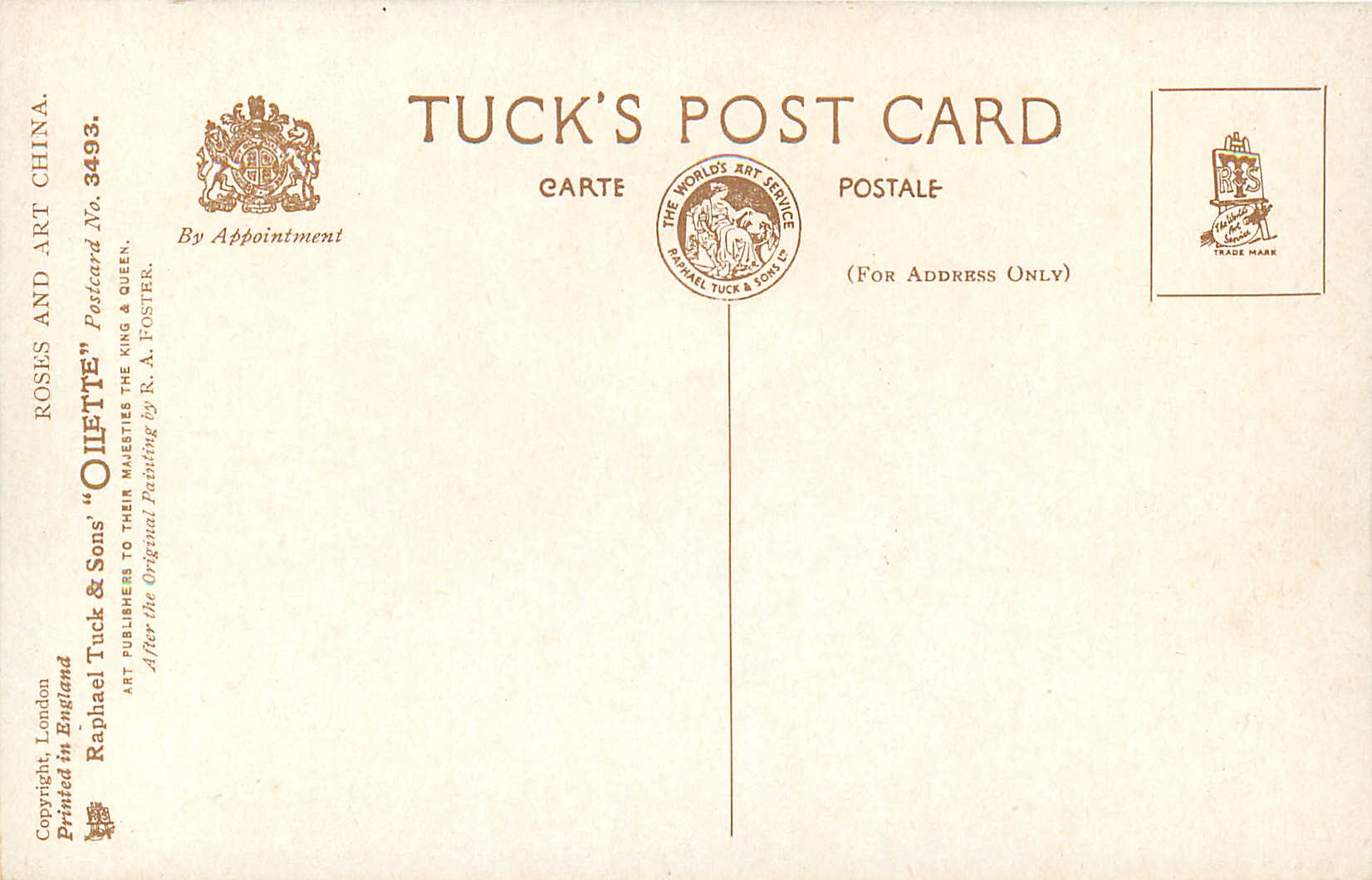 OILETTE, PRINTED IN ENGLAND, COPYRIGHT LONDON, come OILFACSIM with O.F. prefixes, AFTER THE ORIGINAL PAINTING BY R.A. FOSTER, listed in 1927/1928 & 1930 Postcard Catalogues
