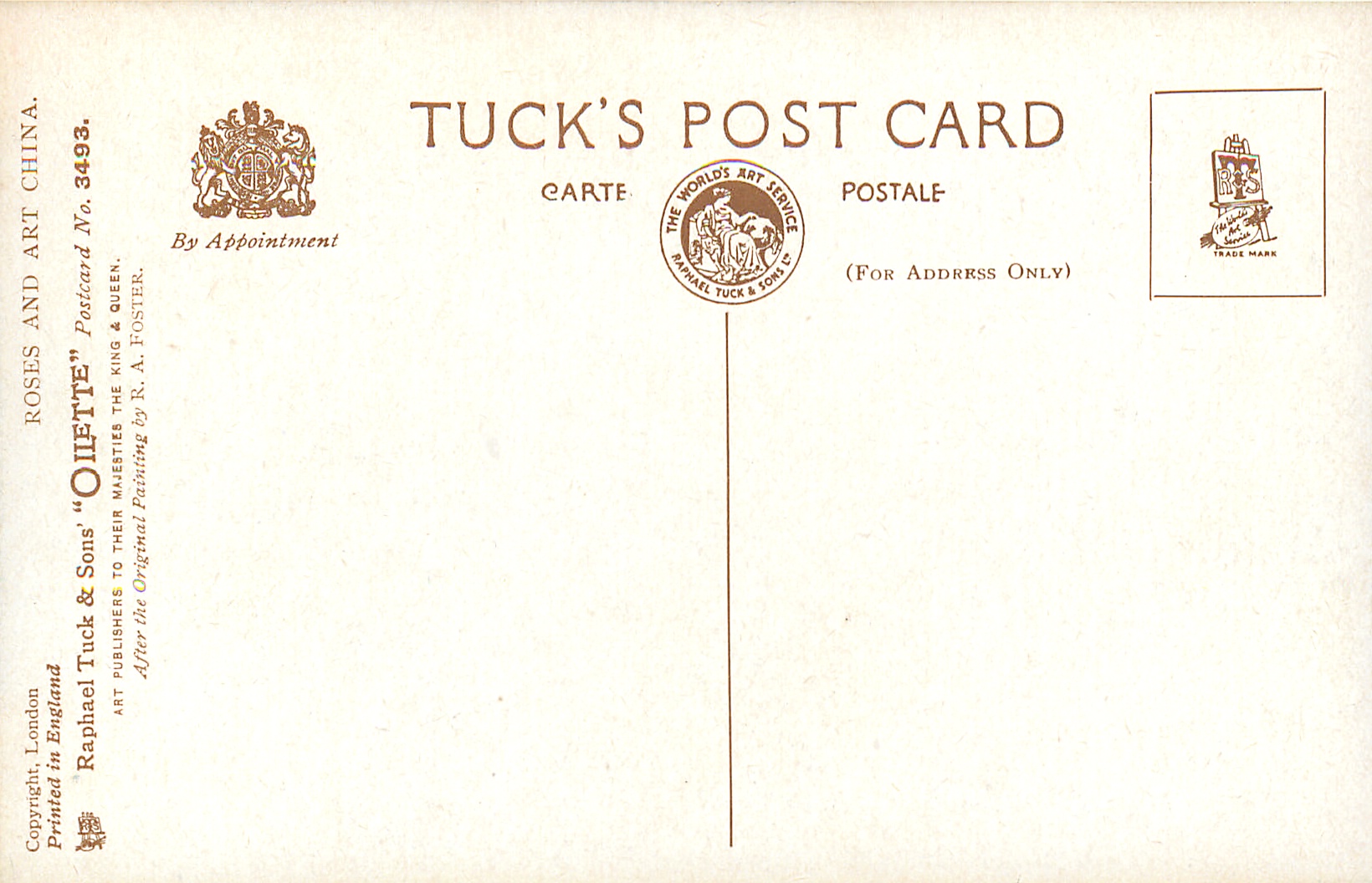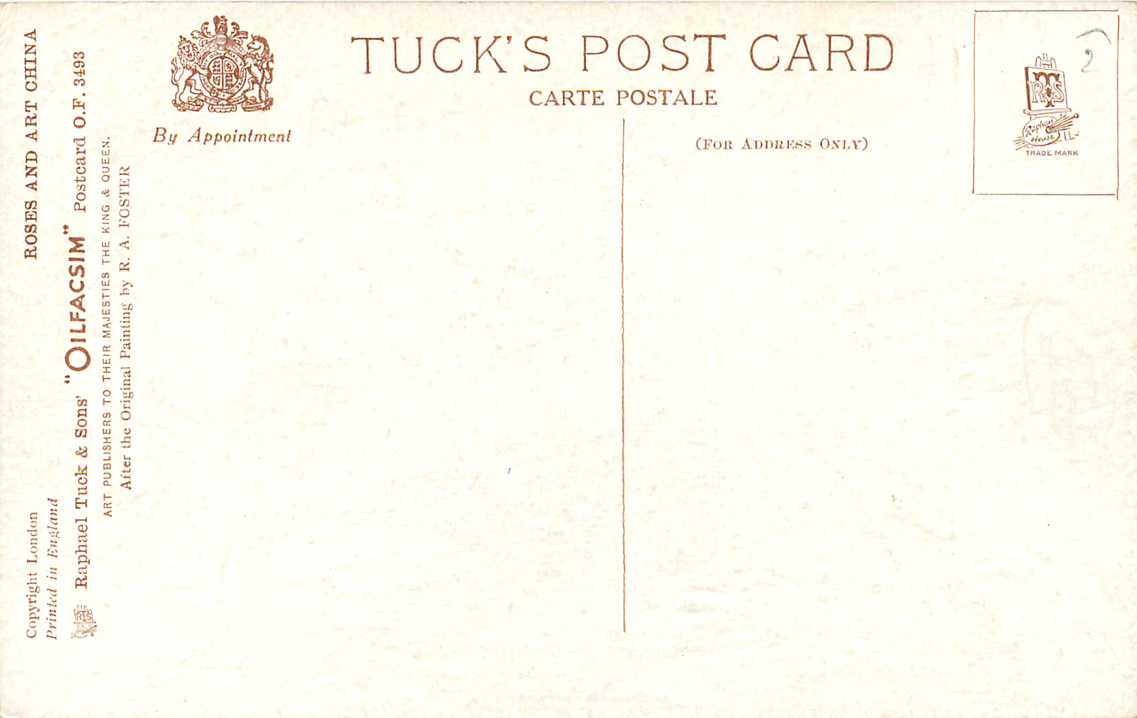 OILETTE, PRINTED IN ENGLAND, COPYRIGHT LONDON, come OILFACSIM with O.F. prefixes, AFTER THE ORIGINAL PAINTING BY R.A. FOSTER, listed in 1927/1928 & 1930 Postcard Catalogues