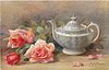 light blue & white tea pitcher with top, two orange/pink and one red roses left