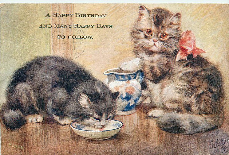 tabby cat sitting with pink bow right with foot on pitcher, black cat left drinking milk from saucer
