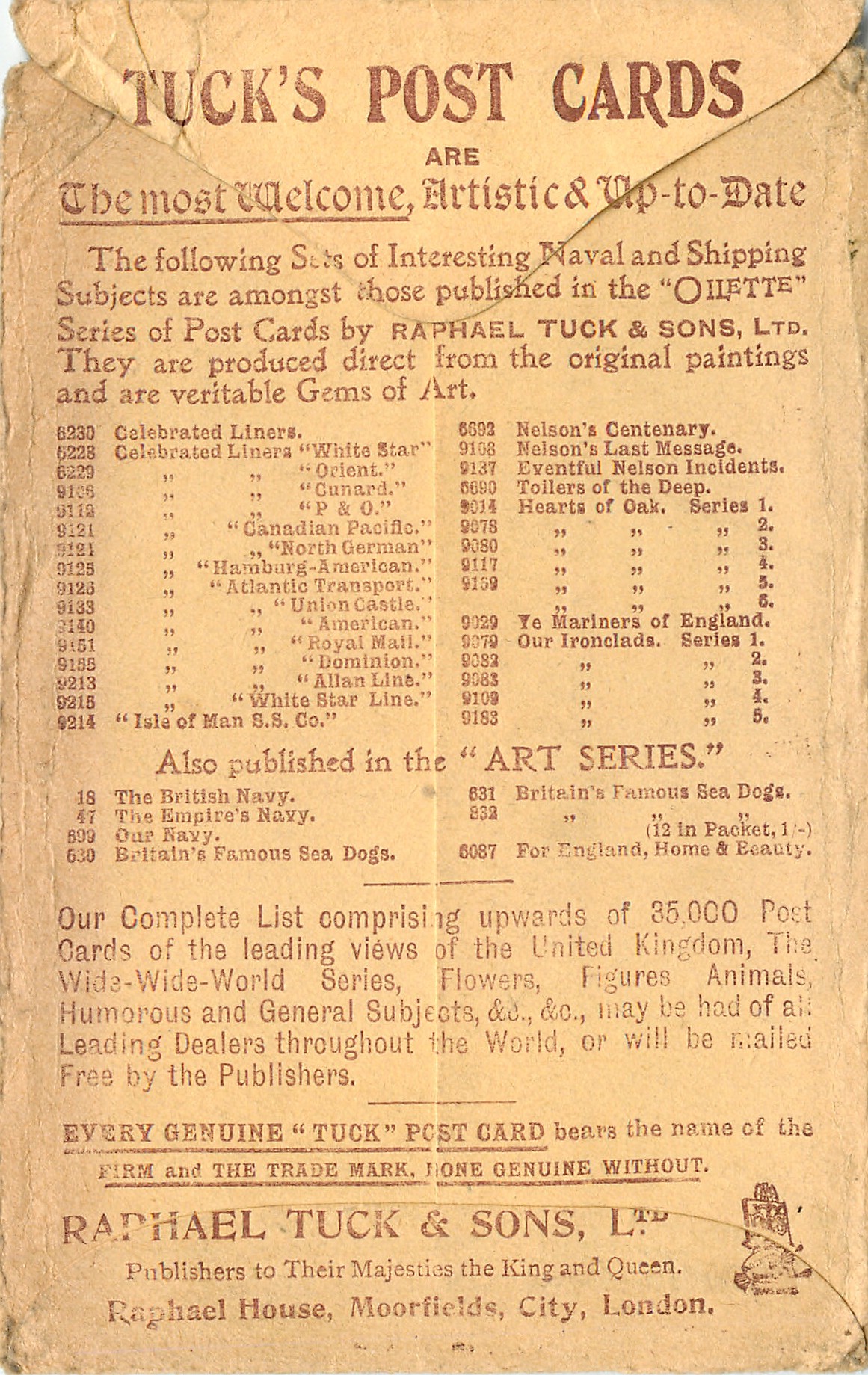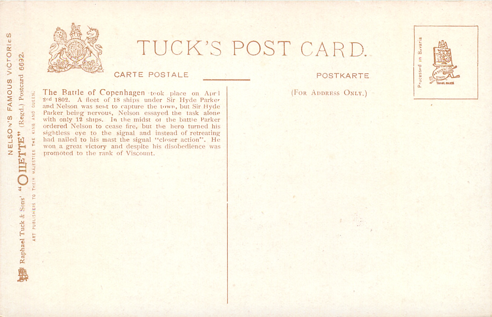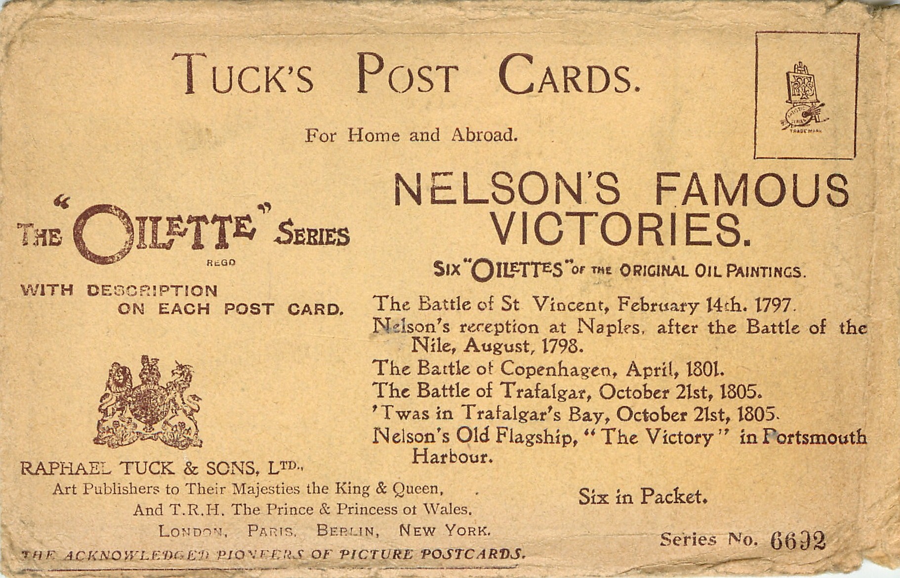 OILETTE, PROCESSED IN BAVARIA (in stamp box), listed in 1914 Postcard Catalogue, same images, except for one card, NELSON CENTENARY 6692