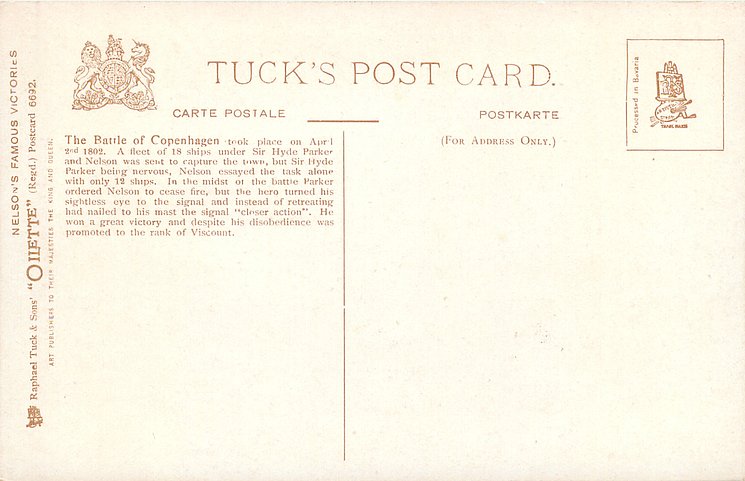 OILETTE, PROCESSED IN BAVARIA (in stamp box), listed in 1914 Postcard Catalogue, same images, except for one card, NELSON CENTENARY 6692
