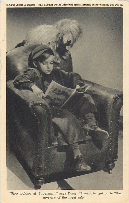 "STOP LOOKING AT 'SUPERMAN'," SAYS DUSTY, "I WANT TO GET ON TO 'THE MYSTERY OF THE MEAT SAFE'."