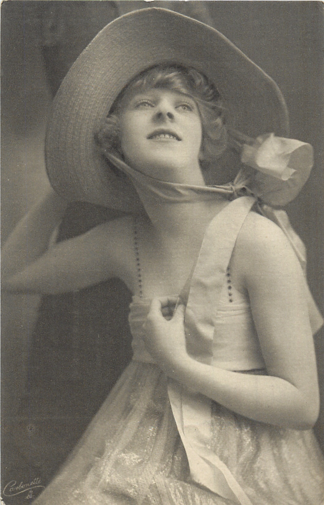 model posed in front of tree trunk, right hand behind large brimmed hat, left hand touches bow/strap chest level